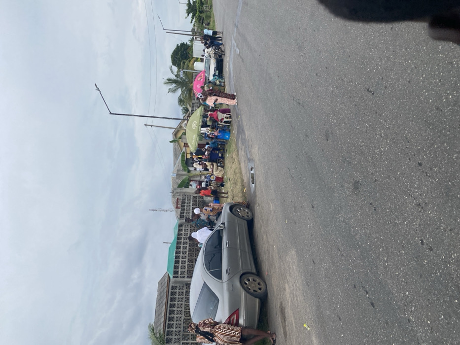 The image depicts an outdoor gathering on an overcast day in the city of Tawpo, Nigeria, situated alongside an asphalt road