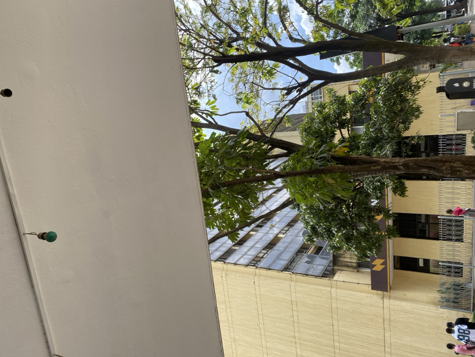 The image depicts an urban street scene in front of the National Bank Building on Harambee Avenue in Nairobi, Kenya. The perspective is from a sheltered, slightly elevated position, looking outwards and downwards. A plain white concrete ceiling overhang occupies the upper third of the frame. A single green-tinted, standard-sized light bulb hangs from a brown wire near the upper left corner of this overhang. To its right, another empty light fixture socket is visible in the concrete. The main subject is a multi-story building with a light yellow or cream facade and horizontal banding. This is identified as the National Bank Building. The upper floors feature numerous recessed windows with blue-tinted glass, some of which appear broken or damaged, exhibiting missing panes or shattered glass. A prominent brown horizontal sign with yellow lettering and a stylized 'N' logo runs across the building at approximately the ground-floor level, displaying the text "NATIONAL BANK BUILDING". Below this sign, the ground-level windows are dark-tinted and protected by dark metal security grates or fencing. Several mature trees with dense green foliage are positioned in the midground, partially obscuring the building's upper sections and extending towards the right. Patches of clear blue sky with scattered white cumulus clouds are visible through the tree canopy. On the paved pedestrian walkway in front of the building: * On the far left, partially obscured by a metal fence, a group of three individuals is visible. One wears a pink shirt, one a white t-shirt with the number "98" on the back, and another a dark shirt. * In the central foreground, a lone female individual wearing a bright pink long-sleeved top and light-colored pants walks from right to left. * On the far right, a dark-colored public waste bin, marked with "NAIROBI CITY" in white lettering, stands on the pavement. A light-colored rectangular utility box is situated on the pavement near this bin. Another individual or small group is partially visible near the waste bin. * A dark, vertical pole, possibly part of a street light or traffic signal, is visible through the trees on the far right. The scene is illuminated by natural daylight.