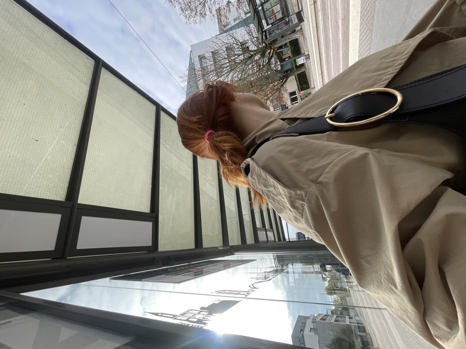 An individual with red hair, secured in a low ponytail with a pink elastic, is depicted from behind and slightly to the right, inside a public transport shelter in Illkirch-Graffenstaden, France