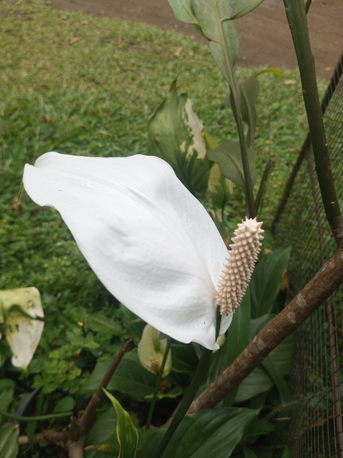 The image displays a close-up view of a single Spathiphyllum flower, commonly known as a Peace Lily, situated within a natural, vegetated environment. The primary subject is the flower, positioned slightly to the left of the frame's vertical center. It features a bright white, ovate spathe, exhibiting visible venation, which partially encloses an elongated, cream-colored spadix. The spadix is densely covered with numerous small, pointed protuberances. The flower's stem is green and emerges from dense foliage. The background consists of green vegetation, including areas of short grass and larger broad-leafed plants, some displaying variegation with lighter green or yellowish patches. To the right of the flower, a brown, textured branch or stake runs diagonally upwards from the lower right corner, partially obscuring a dark, grid-like structure, consistent with a wire fence or trellis. The scene is illuminated by natural, ambient light. No individuals or overt actions are present. Based on provided contextual information, this scene is located in Tecuci, Romania.
