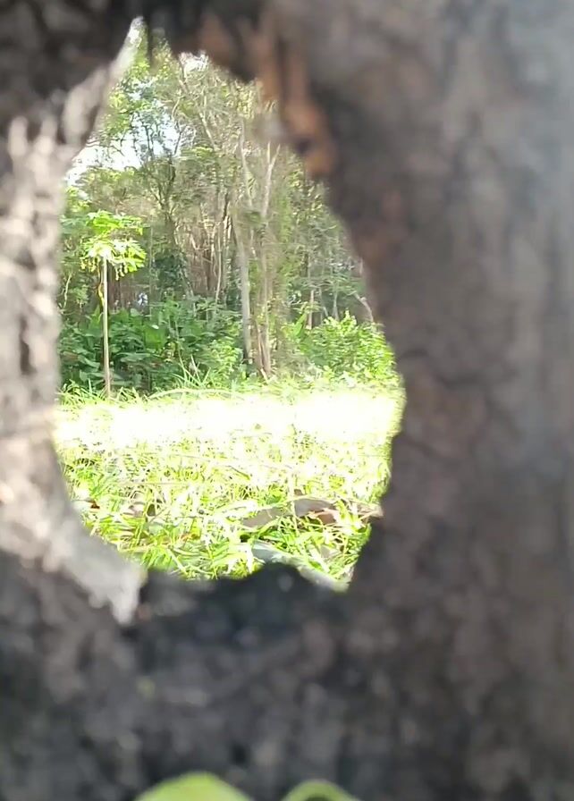 view of a forest through a hole in a tree. The camera moves to reveal a field of grass and trees in the background. There is a black pipe laying on the grass. The sky is blue.