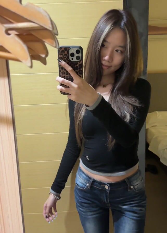 A young woman takes a selfie in a hotel room. She has long brown hair with a blonde streak in the front and is wearing a black long-sleeved top, blue jeans, and a bracelet. She holds a phone with a leopard print case. The room has wood paneling and a mirror. A bed is visible in the background. The woman is looking at the camera.
