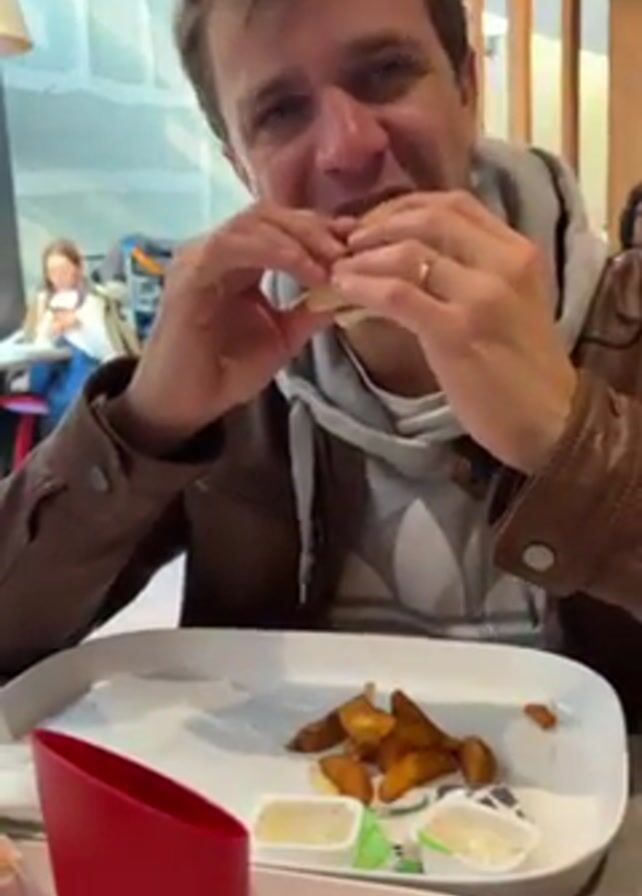 A man is eating a sandwich in a fast-food restaurant. He is wearing a brown leather jacket over a gray hooded sweatshirt, and has sunglasses perched on his head. He takes a large bite of the sandwich, closing his eyes and grimacing with pleasure. In front of him is a white tray with several fried potato wedges and two small containers of white sauce. To the left of the tray is a red plastic cup. In the background, other people are sitting at tables, and the restaurant has a casual, modern design.