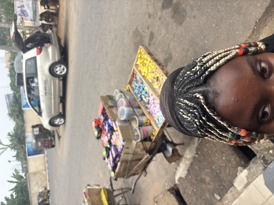 The image depicts a street scene in Umuahia, Nigeria, captured from a low, first-person perspective. The foreground shows the upper portion of a person's dark-skinned face, specifically the eyes, and the top of their head. The individual's hair is styled in black and blonde/light-colored cornrows/braids, with several braids near the temples adorned with multi-colored spherical beads (orange, green, clear). Immediately beyond the foreground subject, on a concrete surface adjacent to the road, is a mobile vendor's cart, possibly a modified wheelbarrow. This cart is laden with merchandise for sale: cardboard boxes filled with various packaged snacks and candies are visible on the upper level. Below these, several transparent plastic containers hold smaller items, and a segmented wooden tray displays an assortment of colorful, individually wrapped sweets. A second similar vendor's cart is partially visible to the left. The background features a paved, two-lane urban road exhibiting signs of wear and repair. A light-colored minivan, identified by text on its side as "HOTAL," is parked on the right shoulder with its rear hatch open. Two three-wheeled auto-rickshaws are present on the road; one is visible on the left, and another is partially obscured behind the minivan. Further to the right, several individuals are visible seated or standing near rudimentary street-side stalls. A low concrete wall lines the left side of the road, behind which green vegetation and distant buildings are visible under an overcast sky.
