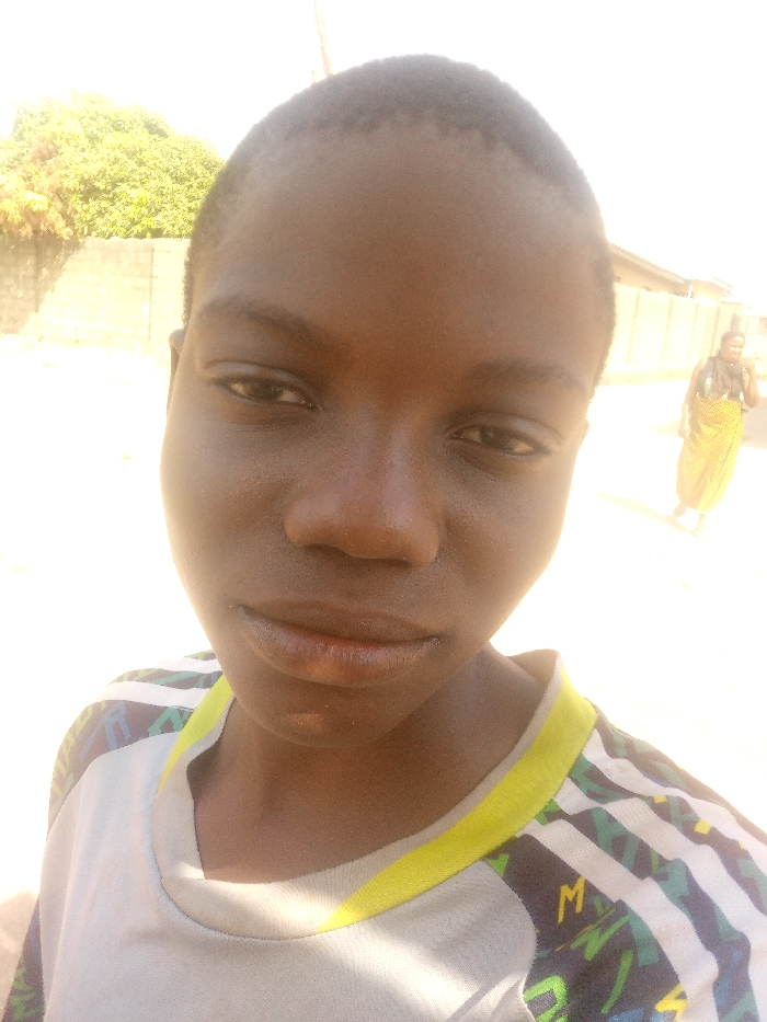 The scene is an outdoor setting within the city of Unknown, Unknown, under bright daylight. The primary subject, positioned in the foreground, is a young individual with dark skin and very short dark hair, looking directly at the camera. They are wearing a light-colored (possibly light grey or white) short-sleeved t-shirt with a lime-green trim around the collar. The sleeves feature a multi-colored pattern including white stripes, green, blue, and yellow elements on a dark background. In the mid-ground and far background, the environment consists of a light-colored concrete block wall on the left, topped with green foliage. On the right, a distant, out-of-focus adult female figure is visible walking away from the camera. She is clad in a long, patterned yellow and dark-colored garment, possibly a skirt or wrap, and a darker top. The ground appears to be an unpaved surface. Strong overhead sunlight illuminates the scene, causing some overexposure in the upper background areas.