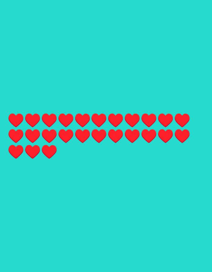 The image features an arrangement of red heart shapes against a solid turquoise background. There are 20 hearts in total, arranged in a way that resembles a horizontal row. The first row consists of 10 hearts and below are two rows containing 5 hearts each. The hearts appear uniformly colored and shaped, creating a repeating pattern. The layout is simple, with the hearts centrally positioned on the canvas.
