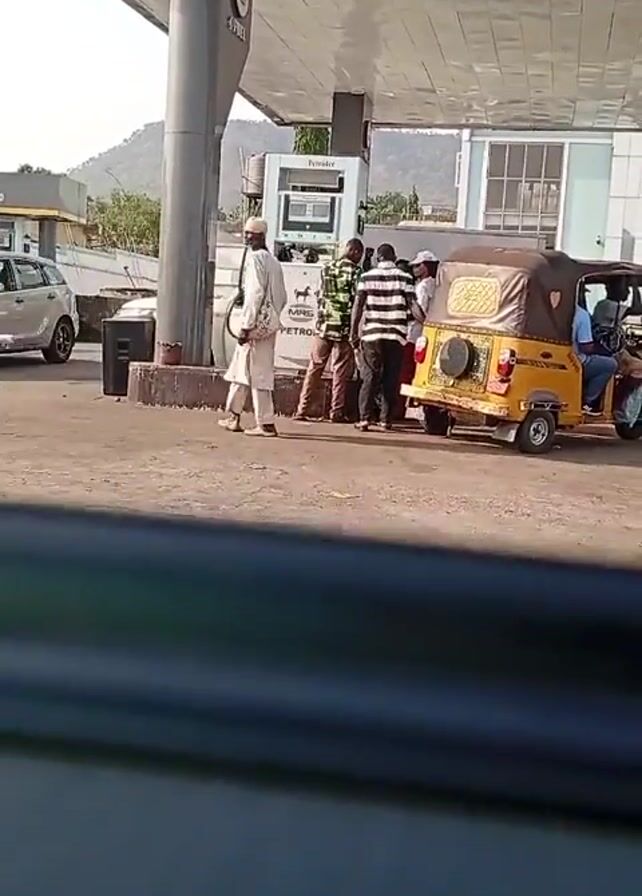 gas station with a small group of people clustered around a yellow auto rickshaw, which appears to be refueling