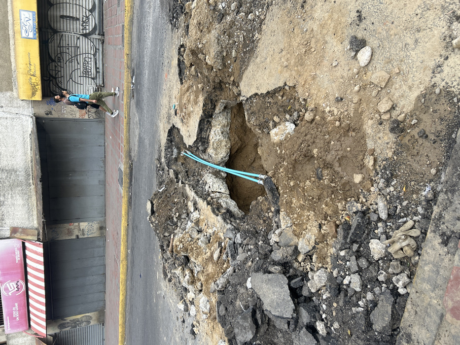 A street-side sinkhole is exposed with blue pipes visible inside