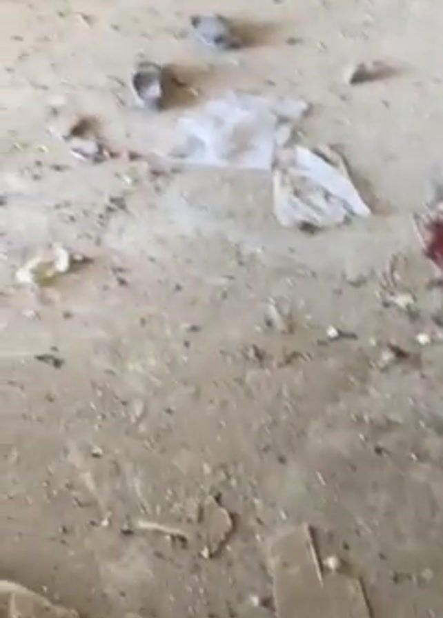 room with a concrete floor that is covered in debris and what appear to be splatters of blood. The camera pans across the room, revealing discarded shoes, metal framing, and other miscellaneous items. A man wearing a gray outfit and a head covering walks into the doorway and looks outside. There are other people visible outside the building. The overall impression is that the room is in disarray and may be the site of a violent event.