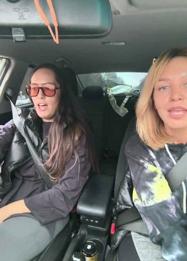 Two women are in the front seats of a car, wearing seatbelts. The woman on the left has long dark hair and is wearing sunglasses and a black puffy vest. The woman on the right has short blond hair and is wearing a tie-dye hoodie. They are both facing forward and appear to be talking. There is a drink in the center console. It's daytime, and the background appears to be a residential area.