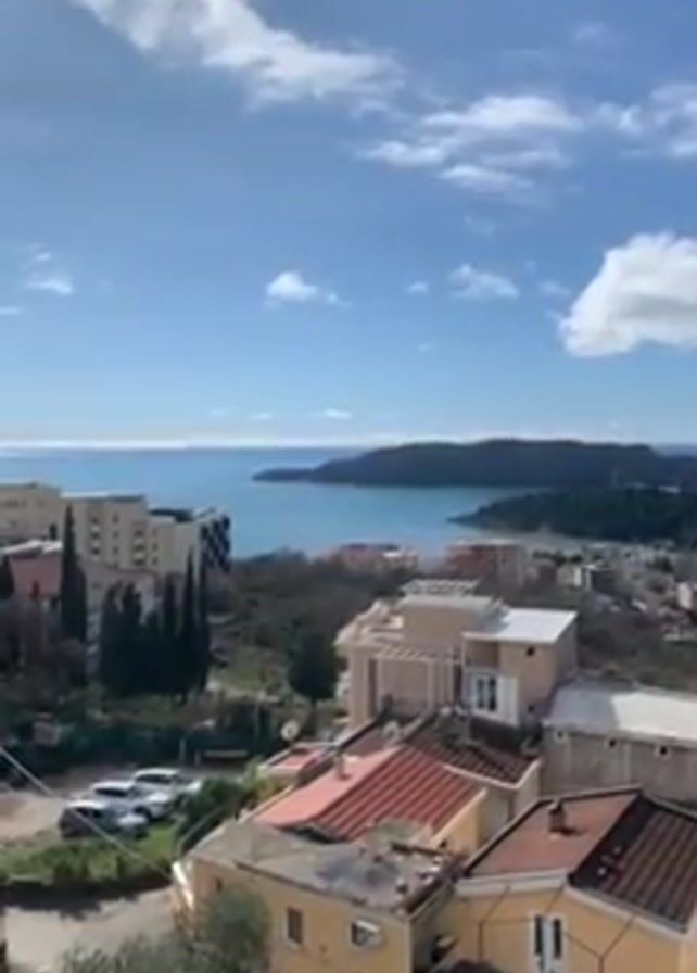 coastal town under a blue sky with scattered white clouds. The town has various buildings, including multi-story apartments and smaller houses with red-tiled roofs. A line of parked cars is visible along a road near the base of the frame. Beyond the town, a body of water stretches to the horizon, with a dark landmass in the distance. The water appears calm, reflecting the light from the sky. The overall scene suggests a sunny day in a Mediterranean-style coastal area.