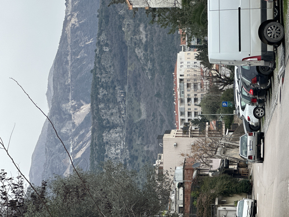 The image depicts a street scene in Budva, Montenegro, characterized by a mix of urban architecture and a mountainous backdrop under an overcast sky
