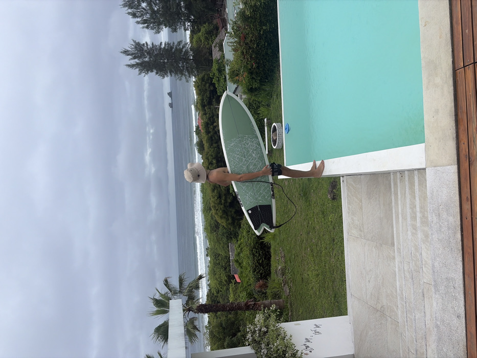 The image displays a male individual standing in profile on the concrete edge of a turquoise swimming pool, overlooking the Pacific Ocean in Ayampe, Ecuador. The subject, bare-chested and barefoot, wears dark swim shorts and a light-colored bucket hat. He holds a light-green surfboard, featuring a white splattered design and a swallowtail shape, under his left arm. A black surf leash is attached to the board. His gaze is directed towards the ocean, which features visible waves under an overcast, grey sky. In the foreground to the left, light-colored stone steps descend beside a white wall with dark handwritten text and white flowering plants. A manicured green lawn extends from the pool's edge towards dense tropical vegetation in the midground, including a tall palm tree on the left and several conifer-like trees on the right. Two distinct dark rock formations are visible in the ocean towards the right of the frame. Partial views of red-roofed buildings are discernible amongst the foliage between the pool area and the coastline. A blue floating object is visible in the pool water.