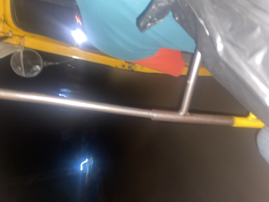 interior of a vehicle, likely an auto-rickshaw, at night. A person wearing a light blue garment and red footwear sits on the yellow seat. A shiny, silver-colored bar runs horizontally across the lower portion of the image, possibly part of the vehicle's frame. A large black plastic bag is visible to the upper right. Light streaks and reflections are seen in the dark background. A side mirror is visible on the left side of the vehicle.