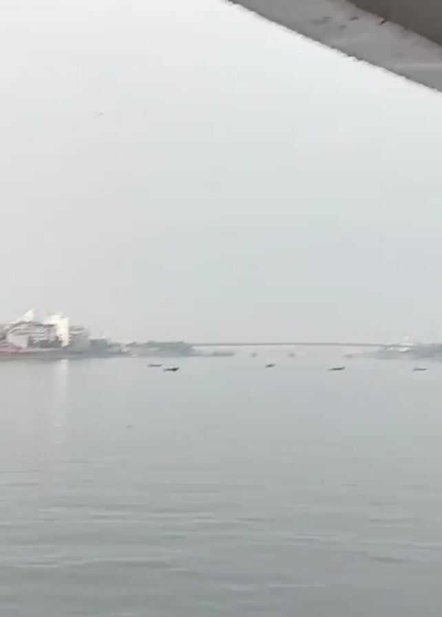 view from a boat on a wide river or bay. The water is calm and grey. In the distance are buildings along the shoreline, a bridge, and a few small boats scattered on the water. The weather appears overcast or foggy, with a pale grey sky. A portion of the boat, including a railing, is visible in the foreground.