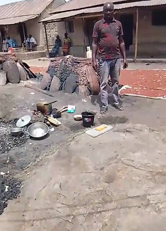 n outdoor cooking area in what appears to be a village or rural setting. In the foreground is a man standing on a concrete surface amidst cooking utensils and other items. There are pots, pans, bowls, a bucket, and some food items scattered around. Behind him, there are two structures, likely traditional cooking ovens, built with large rocks and mud or clay. These ovens have signs of previous use, with ashes and burnt materials around them. In the background, there are several people sitting or standing in front of buildings with corrugated iron roofs, indicative of a courtyard or communal space. A motorcycle is parked next to one of the ovens. The overall impression is of a working outdoor kitchen where food is prepared using traditional methods.