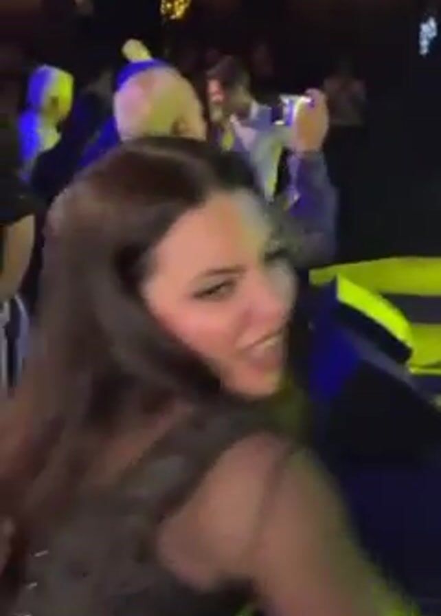 woman having fun in a crowded nightclub or party. At first, the view is unsteady and the camera shakes as it moves through the crowd. The woman, with long, dark hair, is wearing a dark, patterned dress with sheer straps. She looks excited and animated as she turns toward the camera. The scene then shifts to a stage, where a performer is singing into a microphone. She is wearing a sparkly silver dress, long gloves, and a headband. The stage is lit with blue and green lights. People in the audience are recording the performance with their phones. The camera moves around, showing different angles of the stage and the crowd.