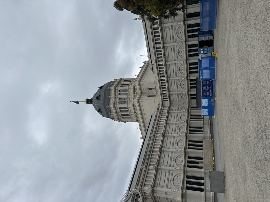 A low-angle shot shows the Royal Exhibition Building against a cloudy sky
