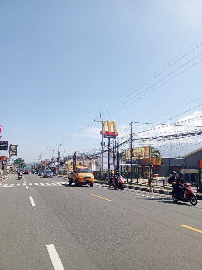 The image displays a daytime street scene in Multhan, India. A multi-lane asphalt road, marked with white and yellow lines, extends from the foreground into the distance. The sky above is clear and light blue. On the right side of the road, a tall sign post prominently displays the yellow McDonald's "M" logo with "DRIVE THRU" text below. The McDonald's restaurant building, featuring red and yellow branding, is visible behind a black pedestrian barrier. Utility poles laden with numerous overhead wires line this side of the street. Three red scooters are present on the rightmost lane or shoulder, traveling away from the camera. The closest scooter carries two individuals, both wearing dark helmets and dark clothing. Another red scooter, occupied by a single individual in a dark helmet and dark clothing, is positioned slightly ahead. Further back, another red scooter with two helmeted occupants follows an orange pickup truck, which is moving in the middle lane. On the left side of the road, vehicles are also moving away from the camera, including a white car, a dark sedan, and another white car in the distance. A person on a white scooter is visible further down the road. Commercial buildings with various signage, including one partially visible sign reading "PUSSA", line this side of the street. Utility poles with multiple wires are present. Distant hills or mountains are visible under the clear sky. The scene indicates active vehicle traffic under bright, sunny conditions.