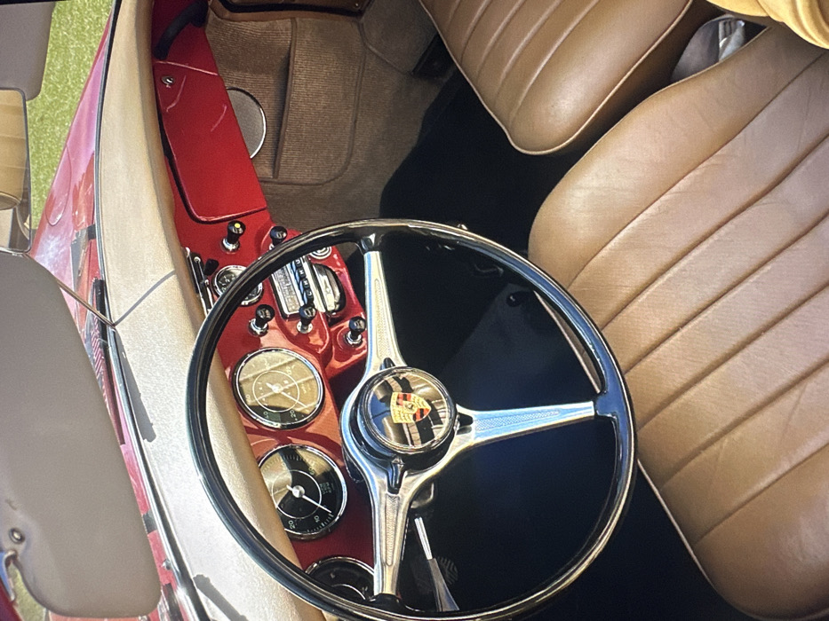 The interior of a classic car features a red dashboard with analog gauges and switches. A three-spoke steering wheel with a Porsche emblem is prominently displayed. Tan leather seats with ribbed detailing add to the vintage aesthetic. The carpet appears neutral-toned, and the overall scene conveys a sense of well-preserved elegance.