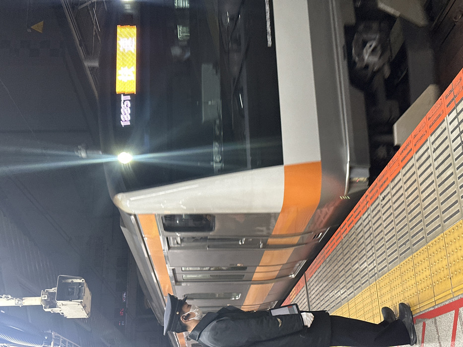 The scene depicts an underground train station platform in Shinjuku, Japan