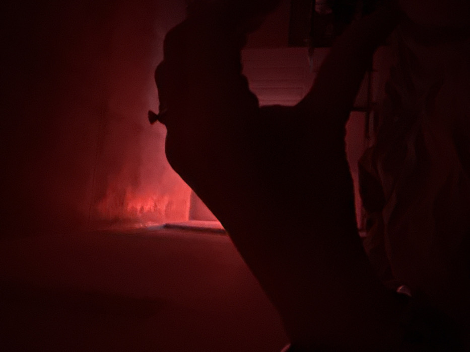A shadowy figure is silhouetted against a red-lit hallway. The person appears to be holding a camera or phone up, creating a strong contrast. The scene is dark and grainy, with minimal detail visible beyond the figure's outline and the red light emanating from the hallway. The overall mood is eerie and indistinct.