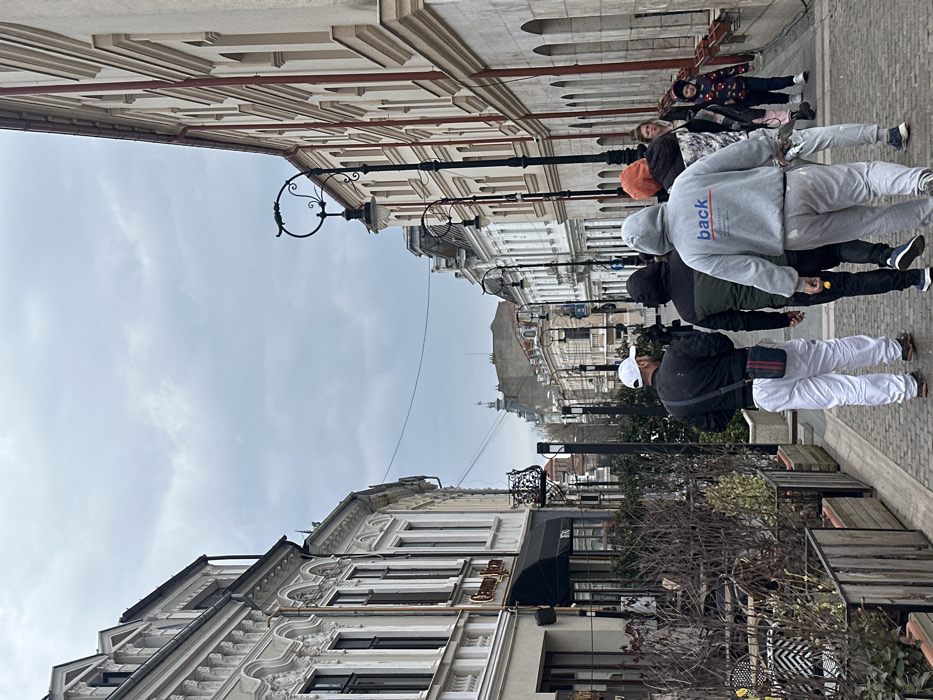 The image depicts a pedestrian street in Craiova, Romania, identified as Strada Unirii, under an overcast sky. The street is paved with blocks or cobblestones. On the left, a row of multi-story buildings features ornate, light-colored facades with decorative moldings, multiple windows, and dormer windows on the rooflines. One prominent building displays a black awning over a storefront with a visible sign "Casino Royal" and "TRC" below it. Planters containing sparse, bare shrubbery and outdoor seating areas are present along this side of the street. On the right, buildings exhibit a simpler architectural style with less ornamentation. One building shows prominent red vertical downspouts and a series of arched windows on a lower level. Decorative black lampposts with circular motifs are spaced along the right side of the street. Utility wires are visible spanning across the street at mid-height. In the foreground, a group of approximately seven individuals is walking away from the camera. The closest person on the left is a male wearing a white baseball cap, a dark jacket, white loose-fitting pants, and a dark cross-body bag with red and blue stripes. Next to him, another male wears a dark hooded jacket and dark pants. A central figure wears a light grey hooded sweatshirt with the word "back" partially visible on the reverse, and matching light grey sweatpants. He holds a white cylindrical object in his right hand. To his right, another individual wears an orange hooded top. Behind these individuals, a female with light hair and a dark jacket is visible, alongside a young child in a patterned jacket and a dark hat. Further down the street, additional indistinct figures are present.