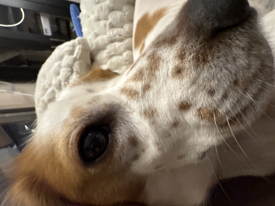 A close-up, angled shot frames the head and upper body of a dog, primarily white with distinct irregular tan and brown spots. The dog's left eye, dark and round with visible eyelashes, is prominent on the left side of the frame, appearing reflective. The muzzle displays white fur punctuated by numerous smaller, scattered tan/brown spots, from which multiple long, thin white whiskers extend. A partial view of a dark nose tip is visible on the far right. A tan/brown ear is partially visible on the upper left. The dog is positioned against a light-colored, textured object, consistent with a quilted blanket or cushion, visible behind its head and upper body. The background is out of focus, indicating an indoor setting with indistinct dark shapes and faint light reflections, including a small blue object in the upper right. The image lacks specific visual cues to determine its location within the city of Sofia, Bulgaria.