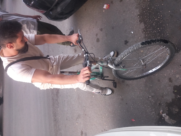 The image captures a street scene in Munin, Syria. A male individual, appearing approximately 20-40 years old with dark hair and a beard, is centrally positioned, leaning forward over a light green and silver mountain-style bicycle. He wears a light-colored short-sleeved t-shirt, matching light-colored track pants, and white and grey athletic shoes; a dark strap is visible over his right shoulder. Both hands grip the bicycle's handlebars, and his head is bowed, directing his gaze downward towards the front wheel. A second individual, wearing a light-colored t-shirt and dark pants, is partially visible standing behind and to the right of the first man. The ground consists of dark, textured asphalt with visible stains, possibly moisture, and minor debris. A black vehicle is partially visible on the right edge of the frame, and a white vehicle on the far left edge. The scene is illuminated by natural light.