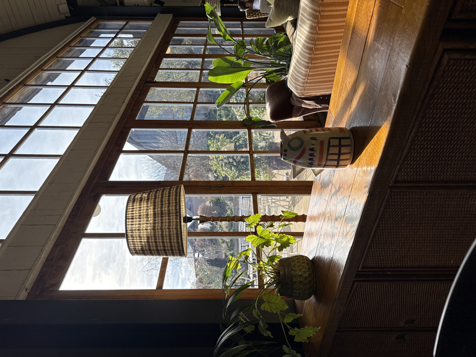 The image presents an interior view within Soho Farmhouse, Great Tew, West Oxfordshire, United Kingdom. A prominent feature is a large, multi-paned wooden-framed window wall, through which bright natural light illuminates the room. A polished wooden counter extends across the foreground, with textured, woven cabinet doors beneath it. On the counter's left, a potted plant with large green leaves is present. To the right, a floor lamp with a plaid-patterned conical shade and a carved wooden base stands against a window. Further right on the counter, a cream-colored ceramic pitcher, decorated with abstract geometric patterns in red, blue, green, and black, is positioned. Through the windows, an exterior scene is visible, including a body of water, an outdoor patio with white tables and chairs, and beyond that, trees, some bare, and a large, light-colored barn-like building in the distance. To the far right of the interior, a striped upholstered sofa and a dark brown armchair are partially visible. A person with dark hair is seated in the background, partially obscured by plants and furniture, looking downwards. The sky outside is partly cloudy.