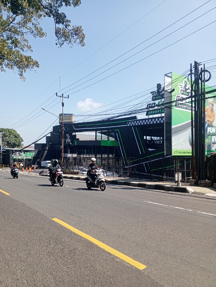 The image displays an outdoor, daytime scene under a clear blue sky with a few sparse clouds. A multi-lane asphalt road, marked by a solid yellow line on the left, extends through the lower portion of the frame. Three individuals, each wearing a helmet, are observed riding scooters on this road, moving from left to right across the image. On the right side of the road, a concrete sidewalk with black and white checkered curbing parallels the thoroughfare. Beyond the sidewalk stands a multi-level building with a modern, racing-themed design, predominantly black with green accents. Large signage on this building reads "GO-LUGE BOGARTS" and "GO.LUGE.PUNCAK," with "Puncak" indicating a location typically associated with Indonesia. A prominent green billboard attached to the building also features the text "GO.LUGE.PUNCAK" and depicts a smiling man wearing a helmet. Overhead, numerous power lines and communication cables crisscross the sky, supported by dark utility poles. One utility pole, positioned near the center-right, has a structure on its roof resembling a water tank adorned with a checkered pattern. Green tree branches are visible in the upper left corner of the frame. Orange traffic cones are discernible near an entrance area on the far left, adjacent to the "GO-LUGE" facility. The scene does not provide any visual evidence to support the location being Multhan, India; rather, the prominent "Puncak" signage indicates a location in Indonesia.