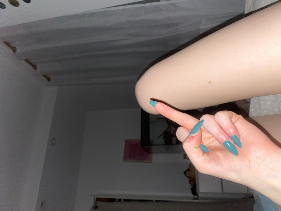 room's corner with a bed's frame partially visible at the top. A person's arm and hand are in the foreground, displaying an extended middle finger. The person's fingernails are long and painted teal. A television is visible against the wall, with a framed image nearby. The wall is painted white and has electrical outlets. The room appears to be dimly lit.