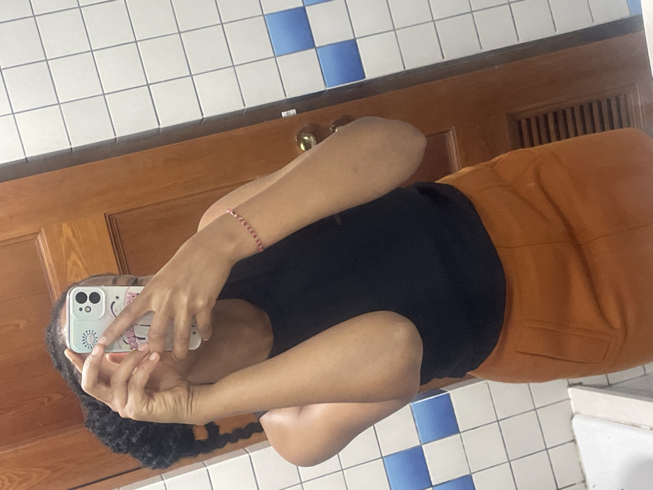 The image displays a mirror selfie of an individual in an interior space. The person, appearing to have dark skin and dark hair styled in braids, wears a black sleeveless top and an orange skirt with front pocket details. They are holding a light-colored smartphone, equipped with a decorative case, with both hands to capture the image, thereby obscuring their face. A red beaded bracelet is present on the subject's left wrist. The background, reflected in the mirror, features a wall tiled predominantly with white square tiles. Blue square tiles are interspersed within the white pattern, forming geometric arrangements. To the right of the subject's reflection, a wooden door with a brass-colored doorknob is visible. A white ceramic fixture, likely a sink or part of a vanity, is partially visible in the bottom left corner of the frame. The image provides no discernable visual information to determine a specific location within Daxing District, China.