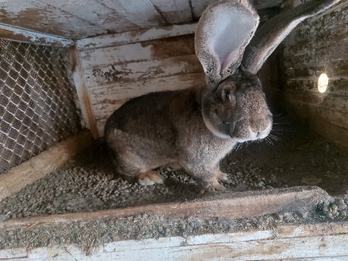 A large brown-grey domestic rabbit stands inside a rustic wooden hutch in Chernogorovo, Bulgaria