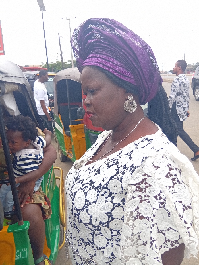 The image depicts an urban street scene in Ura Nta Umuarandu, Nigeria, under an overcast sky. In the foreground, a woman with dark skin stands in profile, facing left. She is adorned with a vibrant purple, intricately folded headwrap (gele), a white floral lace top worn over a dark undergarment, and a large, ornate silver earring on her visible right ear. A silver chain necklace with a decorative pendant is visible around her neck. Long, dark braided hair extends from beneath her headwrap. To the left and slightly behind the woman, a person is holding a young child. The child is dressed in a horizontal blue and white striped top and light-colored bottoms, with dark curly hair, and is looking left. This pair is positioned near the front section of a green and yellow tricycle auto-rickshaw. Another tricycle auto-rickshaw is visible directly behind them. In the midground, between the tricycles, a man in a white t-shirt and dark trousers stands facing left. Further to the right in the background, another man in a black and white patterned long-sleeved shirt walks away from the camera, turning his head slightly left. The environment includes an asphalt road, utility poles with visible wires, and distant greenery, indicative of a populated area with vehicular traffic.