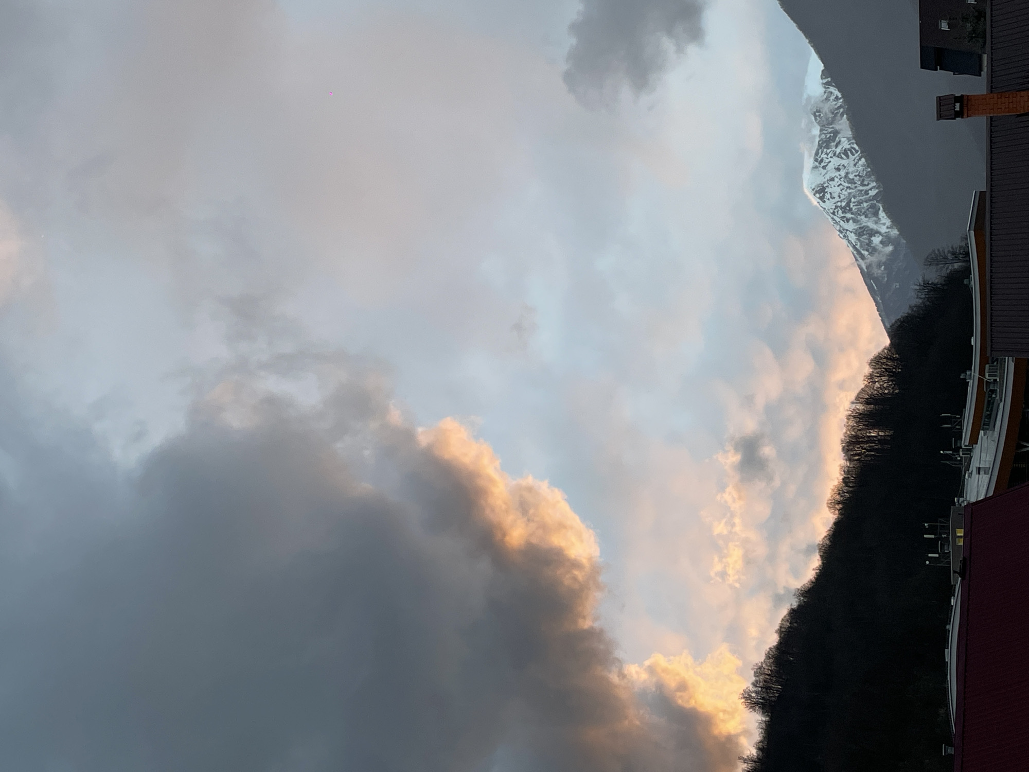 view of the sky and landscape, appearing to be located in Estosadok, Russia. In the upper right corner, there is a partially visible snow-covered mountain ridge. Next to it, there are sections of buildings with dark rooftops. The lower right side of the image shows a dark tree-covered hillside adjacent to buildings. The majority of the image is filled with a sky composed of grey and white clouds, some of which are illuminated with a golden or orange hue, possibly due to the setting sun.