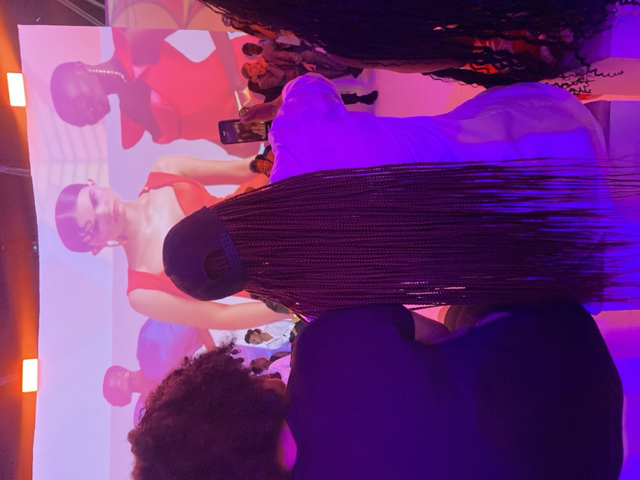 The image portrays an indoor event in Itirin, Nigeria, characterized by predominant purple and pink ambient lighting, with orange light fixtures visible overhead. In the foreground, three individuals are observed from behind, facing a large projection screen. The person on the far left has dark, curly hair and wears a dark top. The central figure, wearing a black baseball cap reversed over long, thin braided hair, holds a black smartphone vertically with both hands, actively recording or photographing the screen. This individual wears a light-colored, long-sleeved top. The person on the far right is partially visible. The large screen displays two female models: a fair-skinned model with dark, styled hair and a red, form-fitting dress with a sweetheart neckline, exhibiting a stern expression; and a dark-skinned model in a red dress featuring prominent shoulder details and pearl drop earrings. Multiple indistinct figures, likely audience members, are visible seated and standing in the mid-ground and background, observing the screen.