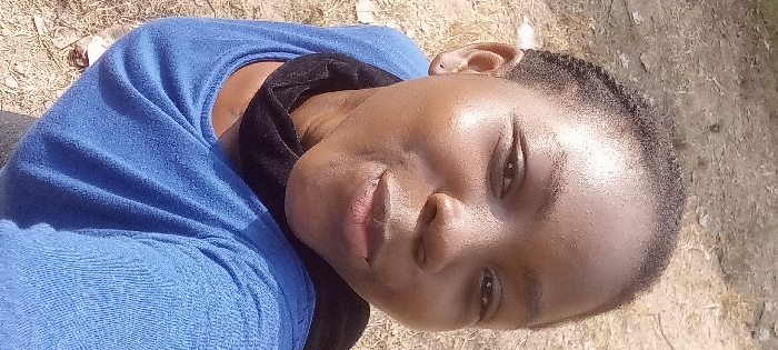 An upward-angled portrait, likely a selfie, features a young adult female with dark complexion and short, dark, braided hair