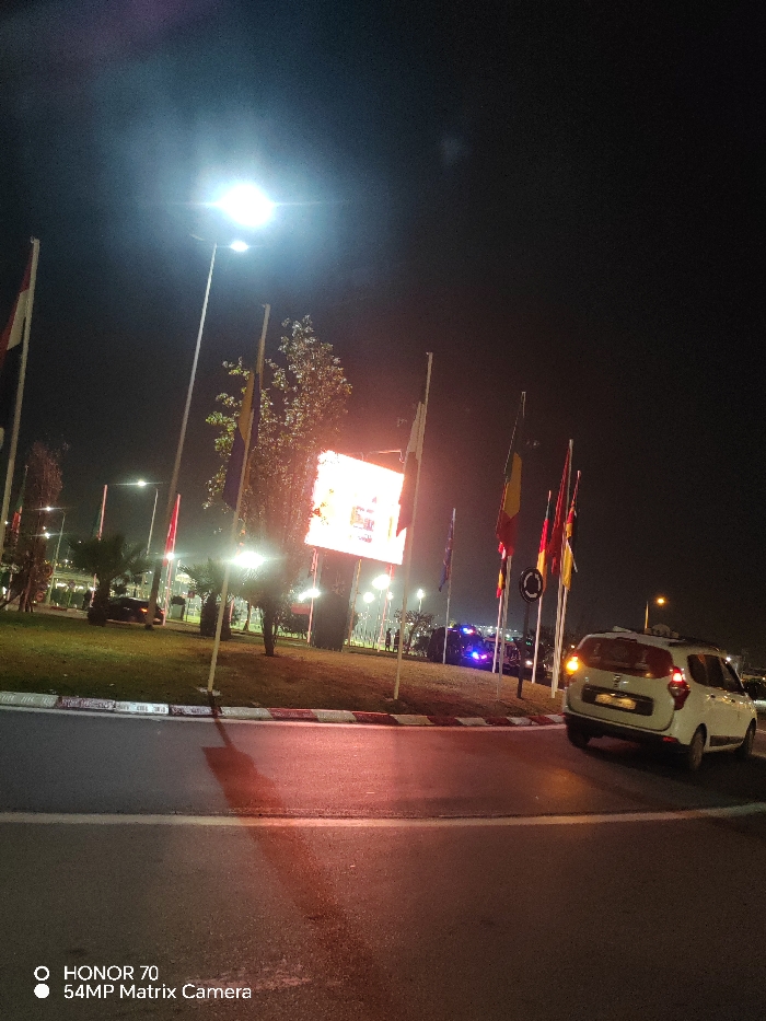 A night scene depicts a street with a roundabout featuring a grassy median. Several flags are planted on the median. A large LED screen illuminates the area. A white car is driving on the roundabout. A dark-colored car and an emergency vehicle with flashing blue lights are visible in the background. Streetlights illuminate the scene. The road is wet, reflecting the lights.