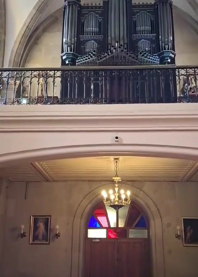 The interior of a church is shown from a low angle, revealing an organ on a balcony, the curved ceiling with exposed stone arches, and a chandelier illuminating the entryway. The organ is dark and imposing, featuring rows of pipes and intricate details. The balcony has a black metal railing and statues positioned along the edges. Below, a chandelier hangs from the ceiling, casting a warm glow on the space. The entryway is marked by an arched doorway with stained glass windows above the double doors. Two framed paintings are hung on the walls flanking the entryway. Pews are arranged on both sides of the aisle, which is covered with a black and white checkered pattern. The walls are pale and aged, adding to the overall atmosphere of the church. A security camera is positioned on the ceiling.
