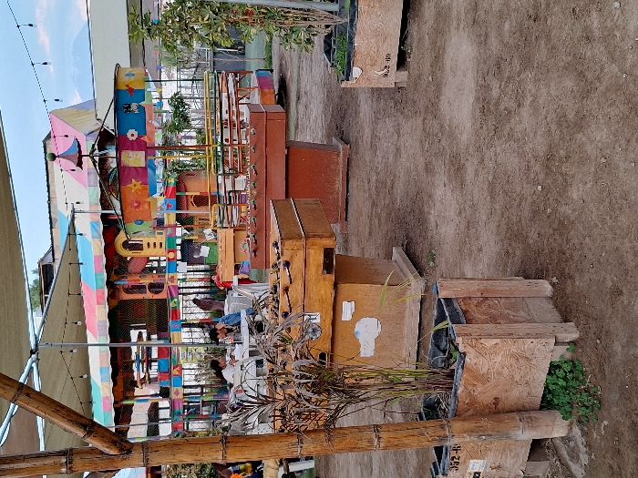 scene in Socabaya, Peru (latitude: -16.459, longitude: -71.545). It is a small, outdoor area with a colorful play structure and a wooden foosball table. There are two people sitting at a table to the left of the foosball table, possibly eating. A large bamboo plant is growing in a wooden planter. The ground is dirt and there are several plants and trees around the edge of the image.