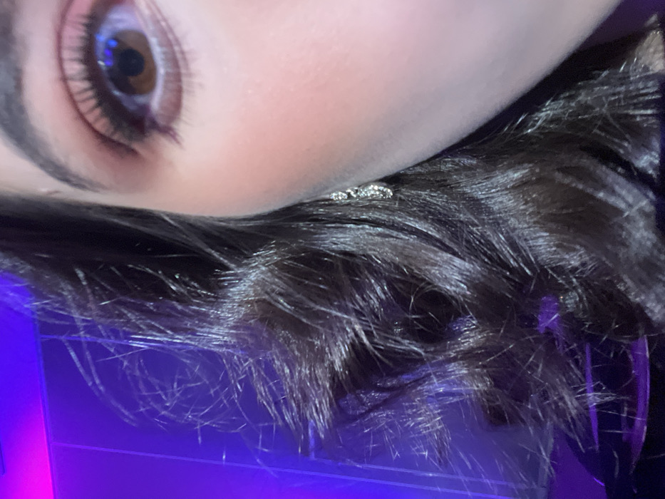 A close-up shot captures a person's eye and part of their face, with dark, thick eyelashes and a brown iris reflecting light. Below, dark hair with highlights is visible, with some strands appearing frayed and slightly wiry. A small, sparkly hair accessory is positioned near the hairline. The scene is bathed in a cool, purple light, creating a surreal and dramatic atmosphere.