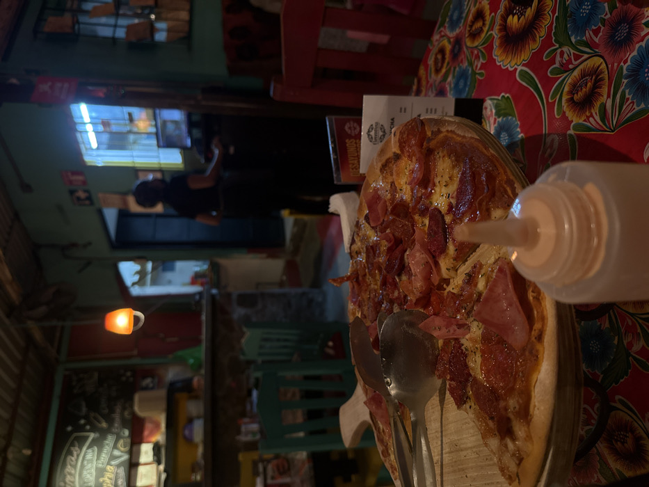 A pizza with pepperoni, ham, and cheese sits on a wooden board, ready to be served. Silver tongs rest beside it. A plastic squeeze bottle with a pointed tip is poised to dispense sauce. The table is covered in a vibrant floral pattern. The surrounding restaurant is visible with tables, chairs, and a light fixture illuminating a chalkboard menu. A person walks through the background.
