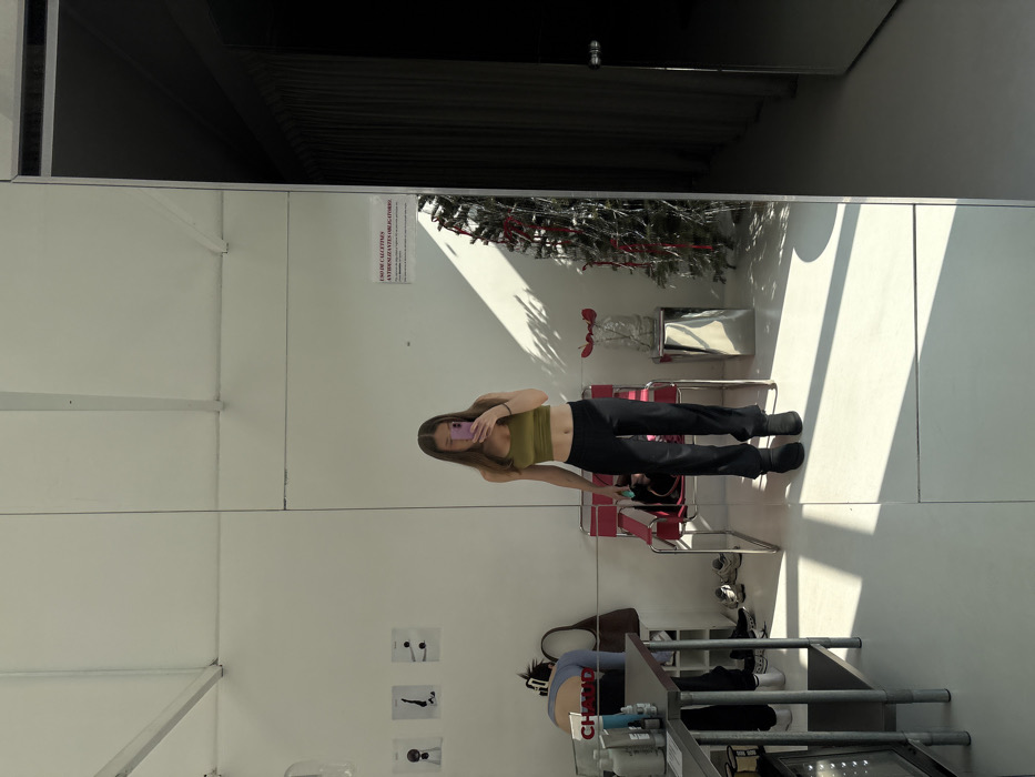 A person in a green top and black pants stands in front of a mirror, holding a pink phone. The reflection shows the person and the room around them. A Christmas tree is in the background. There are several chairs, a table, and other items, including posters on the wall. The overall setting appears to be a dressing room or studio.
