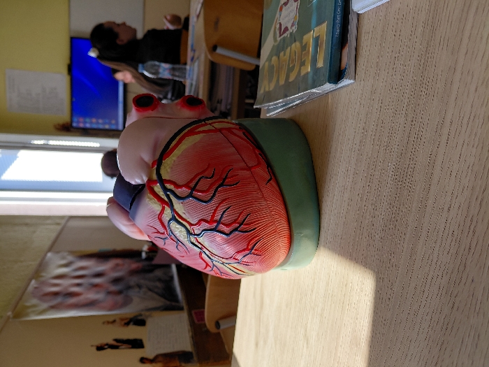 The image depicts an indoor classroom setting in Unknown, Unknown. In the foreground, a detailed anatomical model of a human heart, rendered in red, pink, blue, and black, rests on a teal base on a light-colored wooden desk. Sunlight from a window casts a distinct shadow diagonally across the desk surface from the left. To the right of the heart model, a stack of printed materials is visible, with the top item displaying a partial title that includes "LEGACY." In the midground, multiple individuals are present. One person is partially visible behind the heart model. To the right, a female individual with dark hair tied in a ponytail is seated at a wooden desk, facing away from the camera. A clear plastic water bottle rests on her desk. The background features a cream-colored wall on the left adorned with several posters, including one large, blurred image and multiple smaller, dark silhouette-like figures. A large window on the left allows bright natural light into the room. Towards the right, a section of the wall is painted light yellow, beneath a white whiteboard that is partially obscured by a wall-mounted flat-screen monitor displaying a bright blue screen. Standard classroom furniture, including wooden desks and chairs, populates the room.