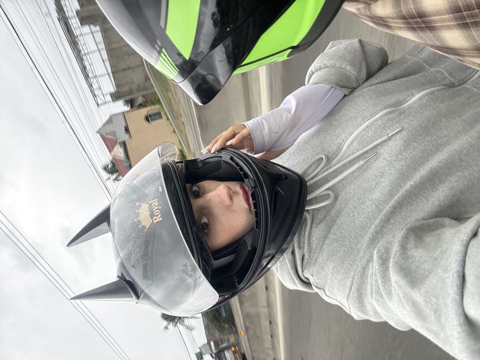A person wearing a helmet with cat ears, labeled "Royal", faces the camera. They wear a gray hoodie and a white sleeve underneath. Another helmet, green and black, is visible above them. The background includes buildings, power lines, and a cloudy sky. The perspective is tilted, suggesting the photo was taken while in motion or at an angle.