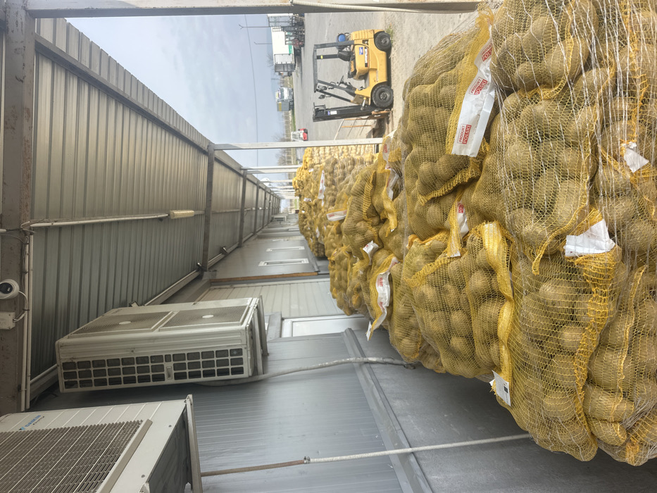 The scene depicts an active loading dock area in Plodovitovo, Bulgaria. Along the length of a grey, corrugated metal industrial building, thousands of potatoes are systematically stacked in yellow mesh bags. Many of these bags feature white labels with "PRODUKT POLSKI" printed in red text. On the building wall, two white Daikin brand air conditioning units are mounted, along with a surveillance camera visible near the top left. A corrugated metal canopy, supported by dark metal beams, extends over the loading area, under which fluorescent light fixtures are attached. The ground surface beneath the canopy and extending into the open yard is paved. In the background, an unoccupied yellow Caterpillar forklift is parked, facing away from the camera. Further in the distance, a smaller red forklift is visible, along with multiple semi-truck trailers and cabs in a large, open yard. The sky is overcast.