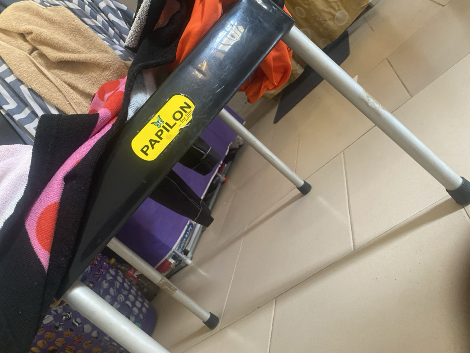 The scene depicts an interior space in Katcha, Nigeria. A black plastic folding chair with four silver-colored metal legs and black rubber feet is positioned on a light-colored tiled floor. A yellow oval sticker displaying "PAPILON ...for life!" with a green butterfly logo is affixed to the chair's black frame. Various textiles, including a black towel with pink and red polka dots, a light pink towel, and a brown towel, are draped over the chair. The chair's black plastic surface exhibits minor scratches. In the background to the left, a purple plastic laundry basket is partially visible, containing what appears to be a dark bottle. To the right, additional textiles in shades of orange, brown, and striped patterns are present on the floor or an unseen surface. No individuals are depicted, and no explicit actions or interactions are occurring. The environment suggests an indoor setting with ambient lighting casting shadows from the chair legs onto the tiled floor.