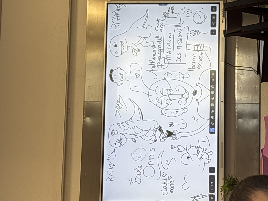 The image displays an interactive digital display (smartboard) mounted on a light-colored wall, approximately 75% of the frame. The smartboard's white screen is covered with black-ink digital doodles and text. Featured elements on the smartboard include: * Two cartoon dinosaurs (Tyrannosaurus Rex-like) drawn on the upper left and upper right, both with "RAW!!!" text bubbles. * A smaller cartoon dinosaur is in the lower left. * A simple human figure with dark hair and a wide smile is in the upper middle, accompanied by "SAM" and a heart symbol. * A larger, stylized human-like head with prominent ears, earrings, spectacles, a large nose, a goatee, and a chocker necklace, holding a small bunch of flowers. * Various text phrases: "École Omnis", "claki marie ❤️", "Anthonio", "Pourgarettie", "Fuck OFF!", "MACRON DES MISSIONS!" (on a banner), "Macron explosion", "Je t'❤️", and "ma gosh". * Multiple heart symbols and small flowers are interspersed among the drawings. * The smartboard's digital toolbar with various drawing functions and page navigation ("1/1") is visible at the bottom of the screen. The environment below the smartboard reveals: * The top of a person's head with dark, curly hair in the bottom-left corner. * A small green potted plant partially visible behind furniture in the lower-left. * A fragment of pink or purple upholstered seating in the bottom left. * A dark wooden chair with a slatted back in the bottom right. * The wall above the smartboard is a uniform light beige, featuring a horizontal metallic trim strip. Based on the visible text "École Omnis", the location is within the premises of École Omnis, a vocational training school situated in Strasbourg, France.