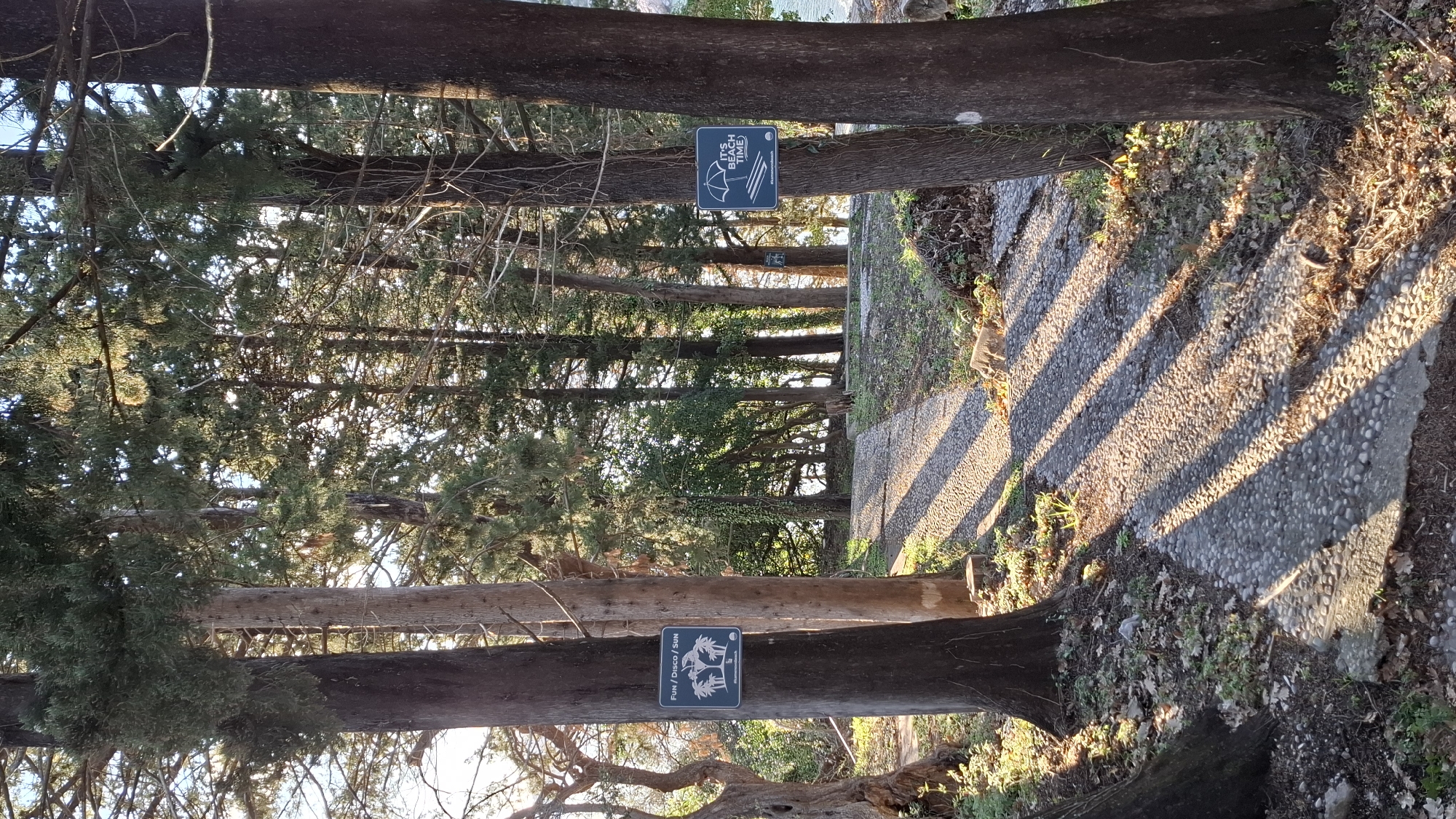 stone pathway bordered by trees in Podbadac, Montenegro. Each tree has a sign attached to it, one reading "IT'S BEACH TIME" with an umbrella graphic and another with palm trees reading "Fun / Disco / Sun". Sunlight filters through the trees, casting shadows on the pathway. The environment suggests a park or garden setting. No people are visible.